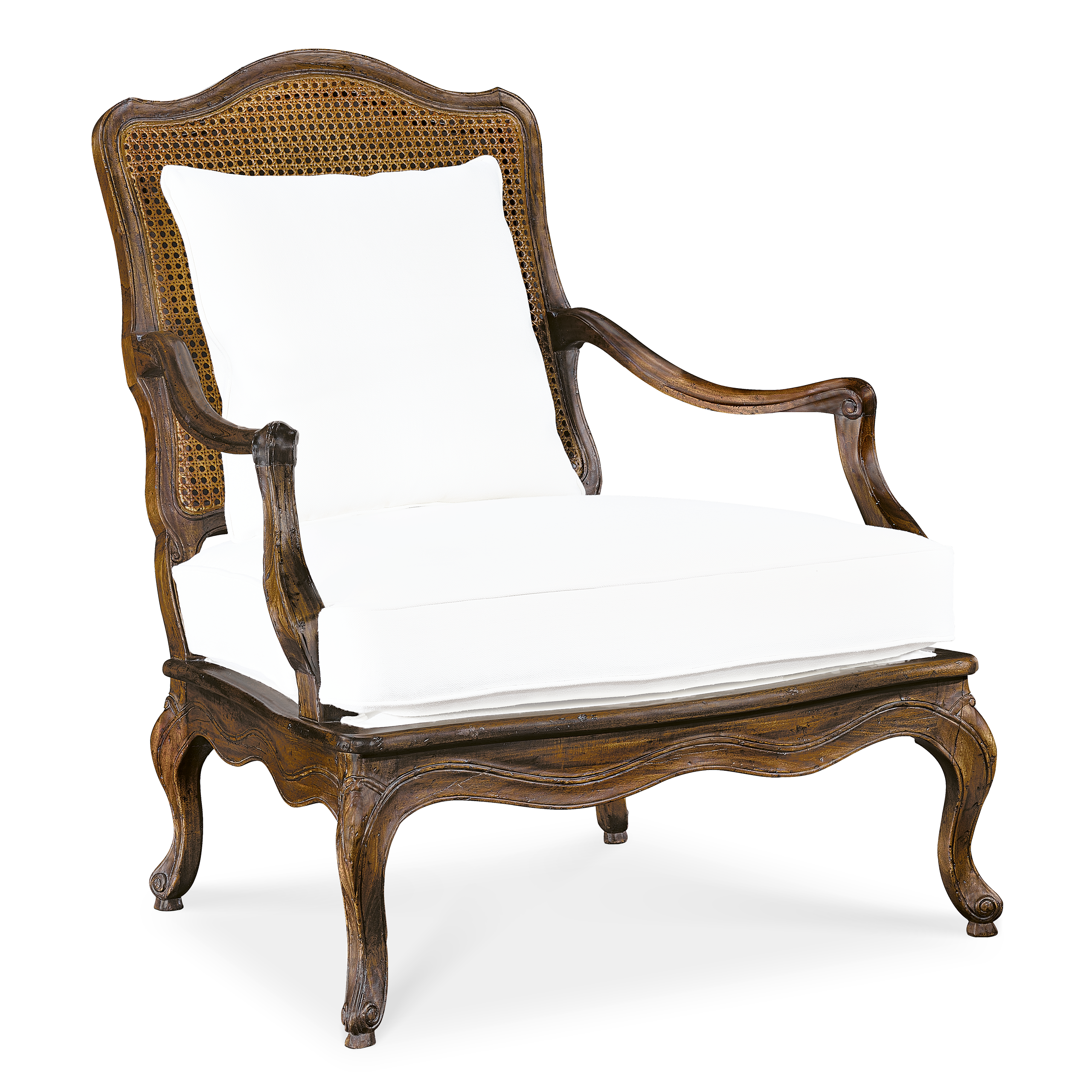 Madera primavera, bejuco en respaldo, cojín asiento tapizado en polyespuma y delcron, cojin con pluma.
