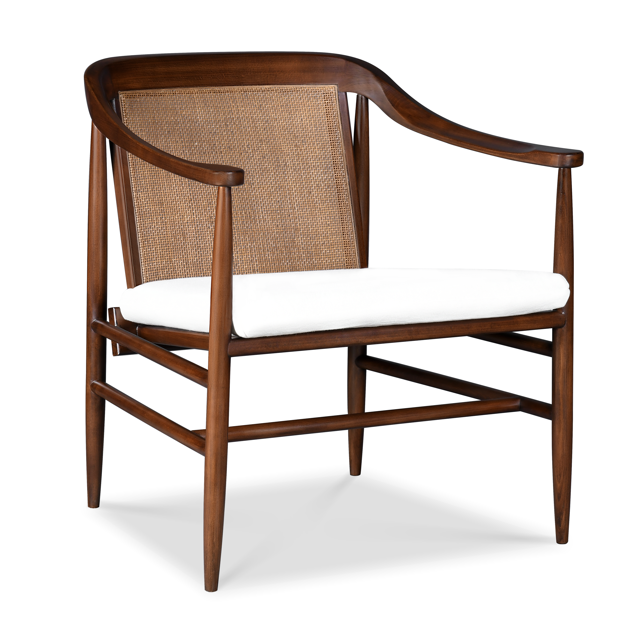 Este sillón se inspira en el diseño danés. El uso de las proporciones en esta pieza es crucial para su belleza. Su respaldo curvado, sus líneas rectas y su respaldo de bejuco tejido a mano resaltan la elegancia de su equilibrada estructura. Cuenta con finos detalles en todo su conjunto, como sus patas puntiagudas y reposabrazos moldeados con un cómodo cojín de asiento tapizado.