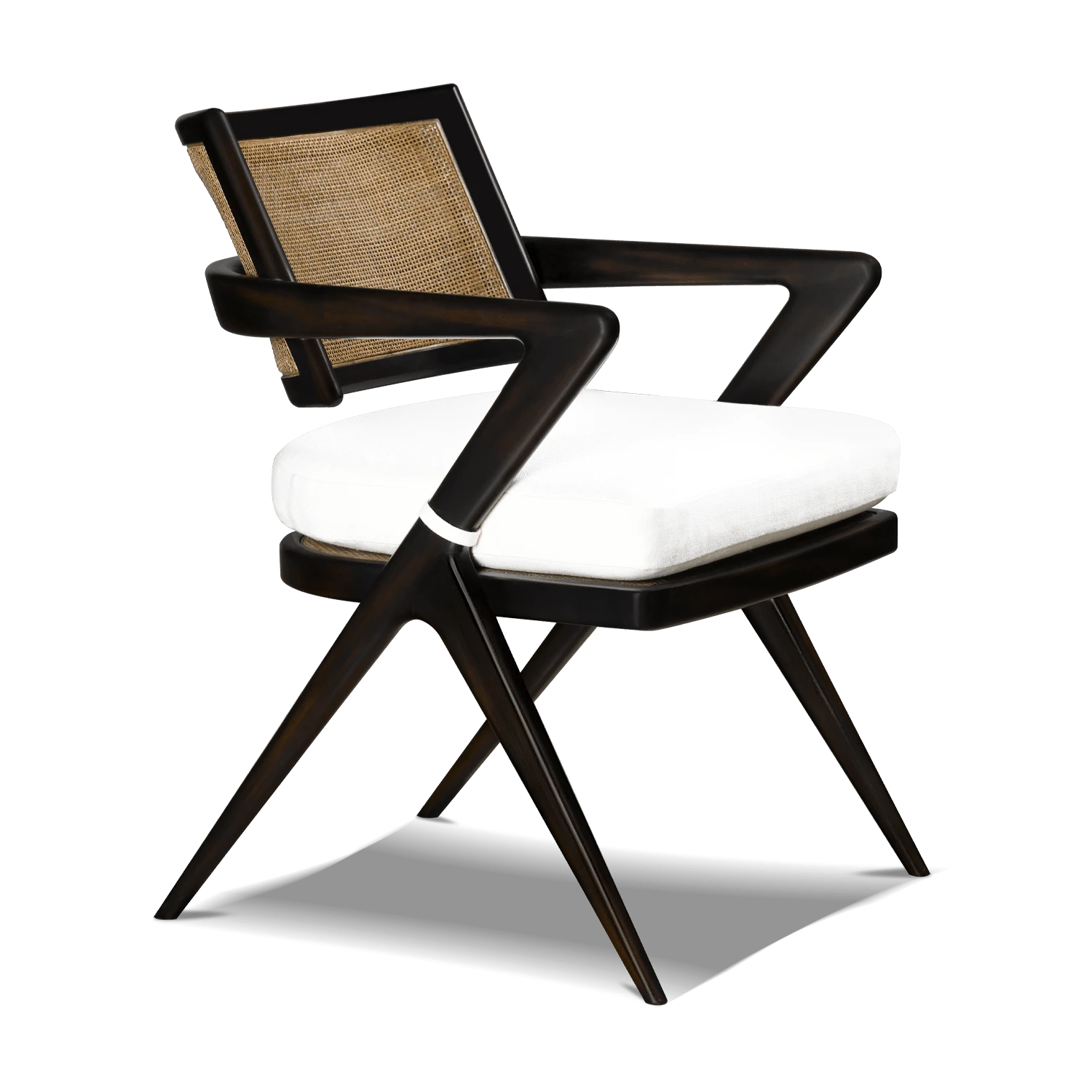 Este sillón de mediados de siglo se inspira en los diseños de Pierre Jeannette. Está fabricado en madera de haya y cuenta con respaldo y asiento de bejuco, tapas de latón envejecido y un cojín que parece flotar. Tiene un respaldo cómodo y curvado, así como patas de tijera.