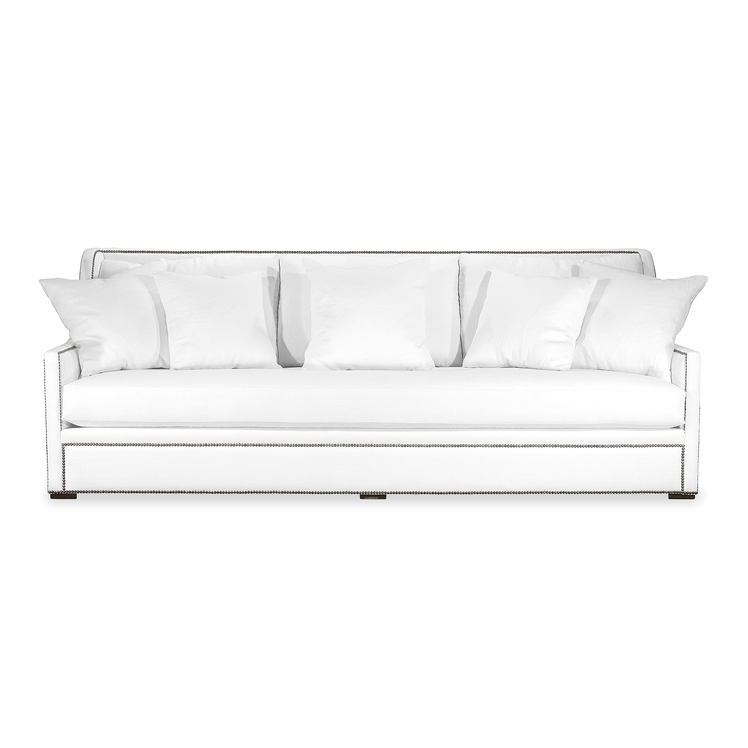 El sofá es una pieza lujosa, tapizada en un tejido blanco impoluto que destila elegancia y sofisticación. Su forma es afelpada y acogedora, con profundos cojines y una silueta bien proporcionada, diseñada para un confort óptimo. Los reposabrazos están graciosamente curvados, añadiendo un sutil toque de estilo al diseño general. El clavillo añade un elemento decorativo que eleva la pieza, proporcionando un contraste táctil a la suave tapicería. También sirven para acentuar las líneas limpias del sofá, contribuyendo a su estética moderna y atemporal. En conjunto, el sofá combina elementos de diseño moderno con detalles clásicos, lo que lo convierte en una pieza versátil que podría encajar a la perfección en una gran variedad de estilos de interior.