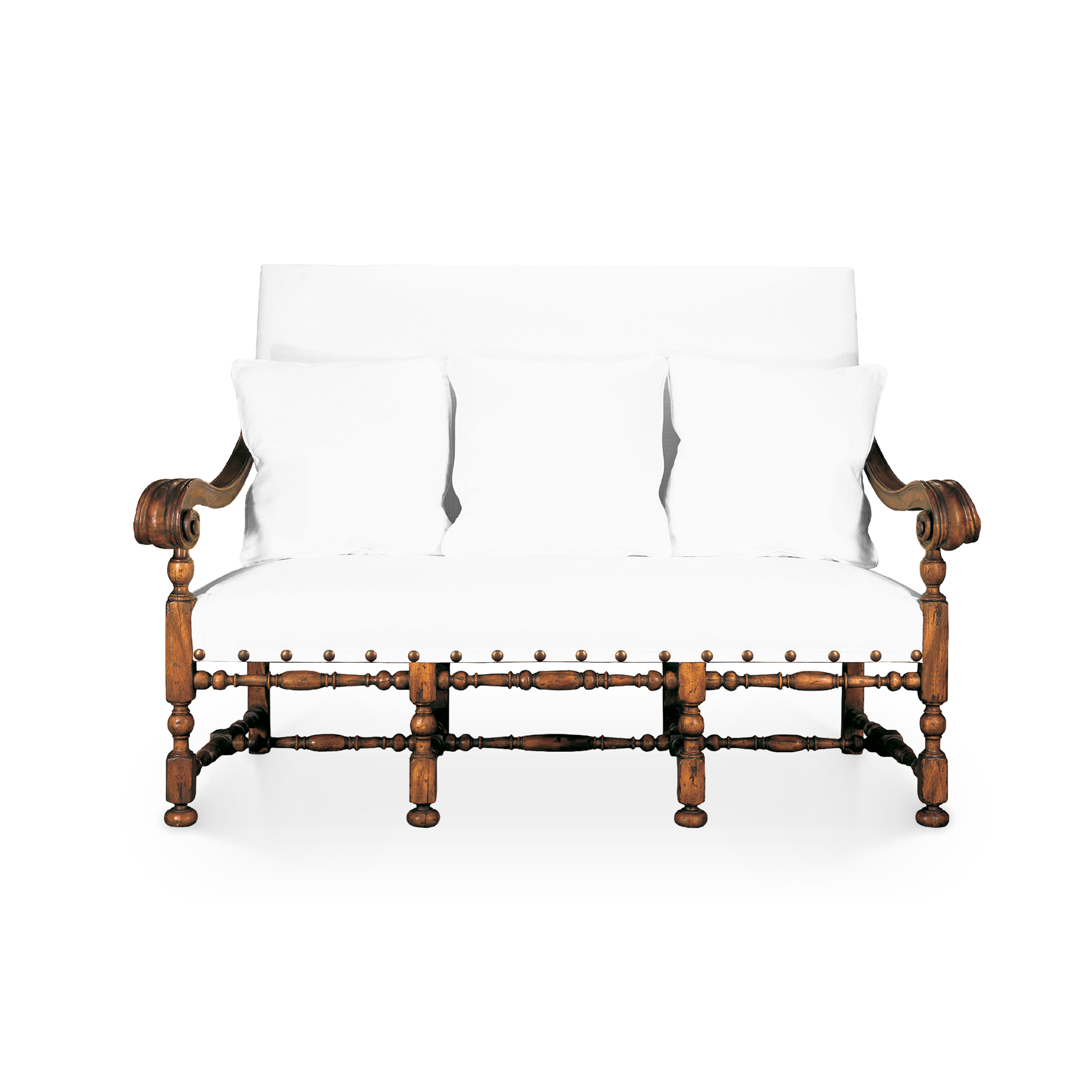 Fabricado en madera primavera. Tapicería en poly-espuma, resorte espiral, pluma, herraje de laton anticado (clavillo).